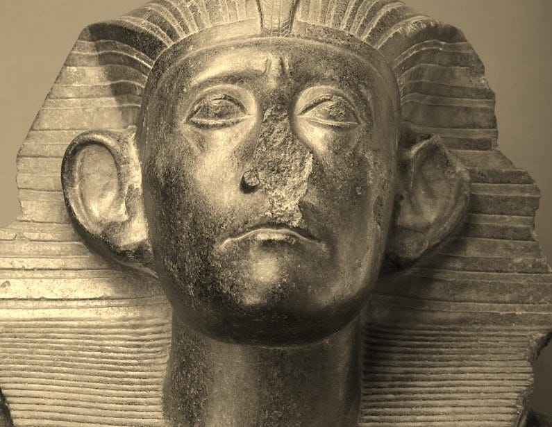 But we have reason to believe that Senusret was not entirely reassured. He is famous for the numerous sculptures he had made of himself, statues carved from black diorite that depict him in strangely realistic fashion, unlike any depictions of a pharaoh that come before. In the statues, his ears are extended to enormous proportions like a bat, perhaps projecting the image of a king who heard every movement in his kingdom, relayed by his extensive system of spies. Three of these statues in particular show Senusret first as a boy, then as a man, and finally in old age. In this final statue we get a sense for the mental toll it took on a man to sit at the top of this paranoid system, the Pharaoh’s weary, sunken eyes, his haggard face contorted in an expression of eternal worry.