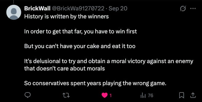 1. It’s over. What was an infinite game—a game played for Life, Liberty, and the pursuit of Happiness—is now a finite game, played not even for the thrill of victory, but for the dark ecstasy of crushing one’s enemies. There are no more players, no more liberals or conservatives, only those who oppose the Right and those who oppose the Left.