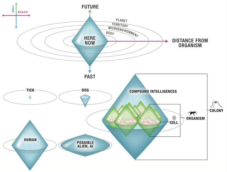 The foundational concept of the article is what the authors call the “cognitive light cone”—the outer boundary, in space and time, of the largest goal a given system can work toward. All intelligences, regardless of embodiment, can be mapped according to the scale of goals they can pursue. A bacterium navigates chemical gradients in its immediate environment; a human plans for retirement; a corporation optimizes across continents and generations.